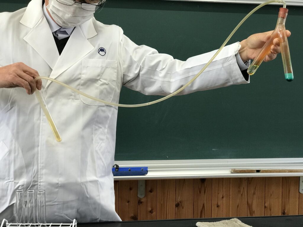 水に溶けにくいという事で、水上置換法で気体を集めました!一酸化窒素は、車の排気ガスにも含まれる気体です。化学の授業ですが、生活する中で関わる様々なものと繋がっているのですね。