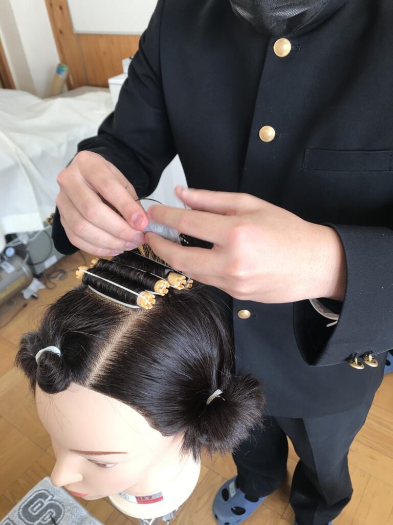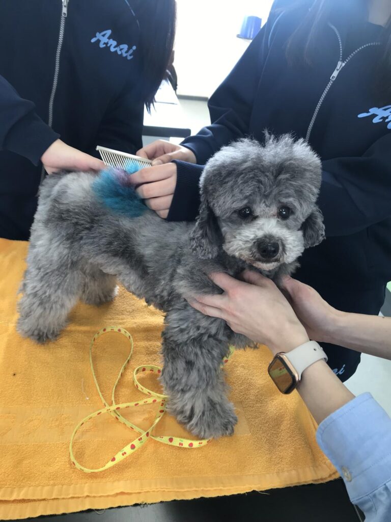 トリミングの全国大会にも出た、専門学校にいるわんちゃんのブラッシングや、美容師を志している人にとっては相棒のようなウイッグさんの頭にパーマをさせてもらいました。
