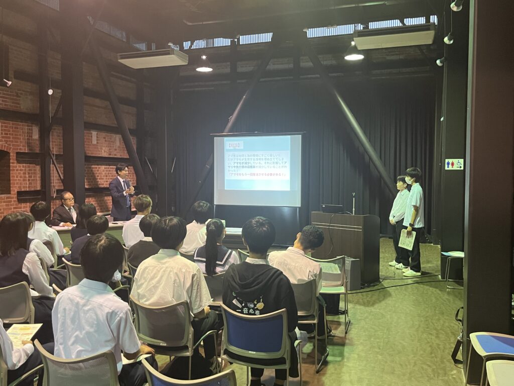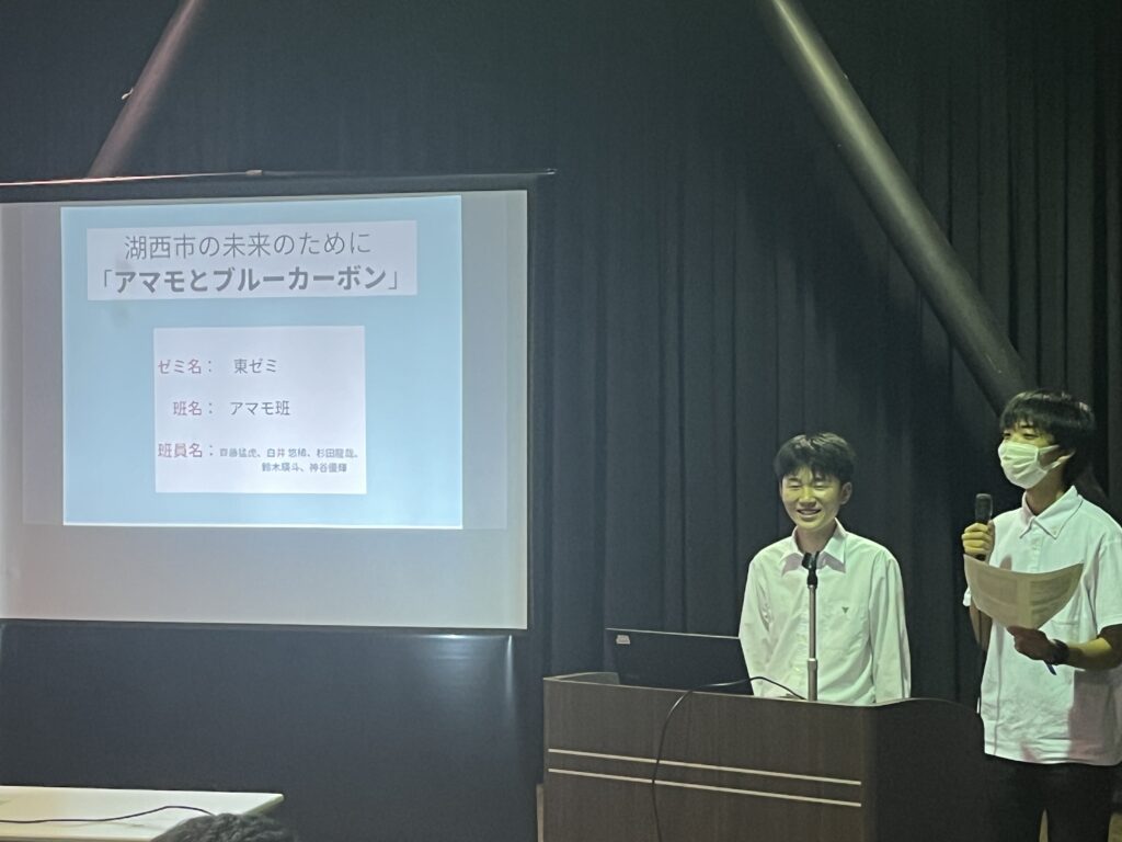 1つ目は、「アマモとブルーカーボン」をテーマにしたアマモ班。環境保全と気候変動対策の観点から、浜名湖におけるアマモ(海草)の保護と活用について発表しました。